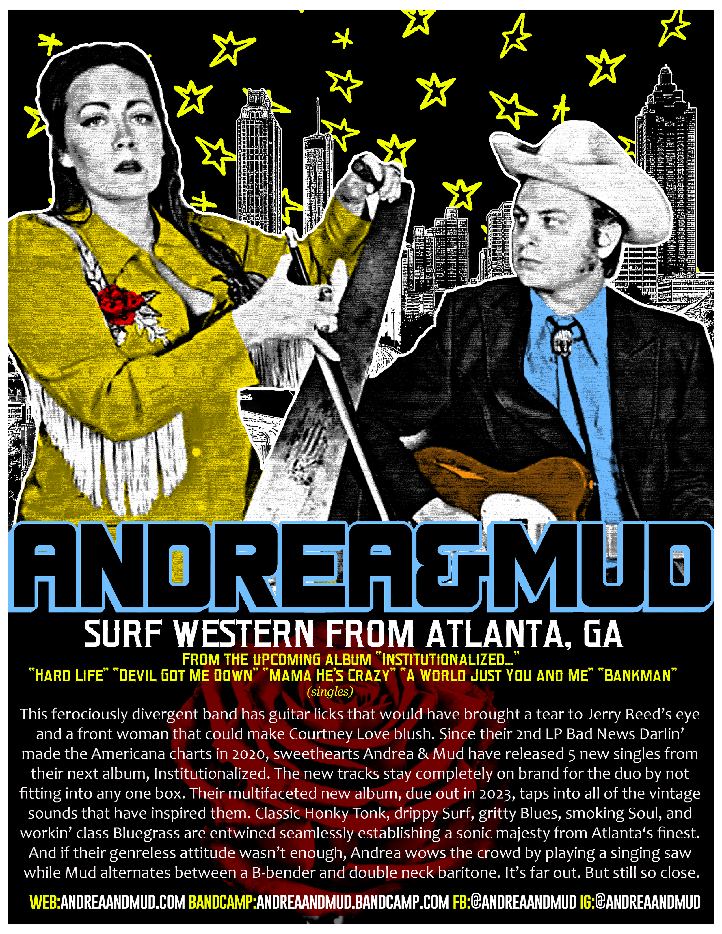 ever wonder what it would have been like if johnny and june were backed by the cramps? if conway and loretta toured with the ventures? if link wray and amy winehouse fell in love, started a band and everything they put out sounded like it was for a new tarantino movie? that is a good start to describing atlanta duo andrea & mud though you have to see them live or listen to a whole album to even begin to understand them. the couple is too Surf for the cowboys and too country for the surfers and they don’t give a damn. their versatility and wide range of inspirations keeps them from blending in with the other bands out there trying to sound like tom petty. if andrea & mud are gonna model their personas after anyone, it’s a dirty blonde truck driver from the ‘60’s and the cute little waitress at the bottom of a hill. but he is the greatest picker in town and she’s a firecracker that plays a saw.